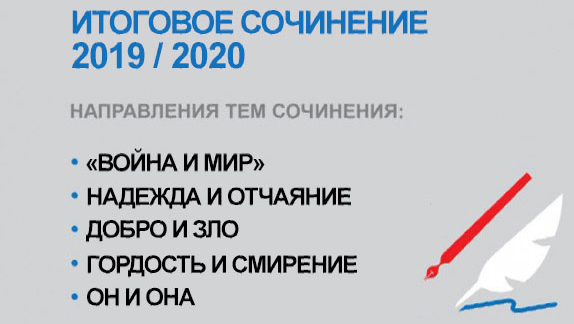 4 декабря 2019 года будет проведено итоговое сочинение для выпускников 11-х классов. Данное сочинение будет оцениваться по системе зачёт/незачёт. Для допуска к ЕГЭ нужно получить зачёт. При получении незачёта будет ещё две попытки в первые среды февраля и мая (5 февраля и 6 мая). Темы итогового сочинения будут в рамках пяти направлений. Участнику необходимо будет выбрать одну тему из любого из пяти направлений.
