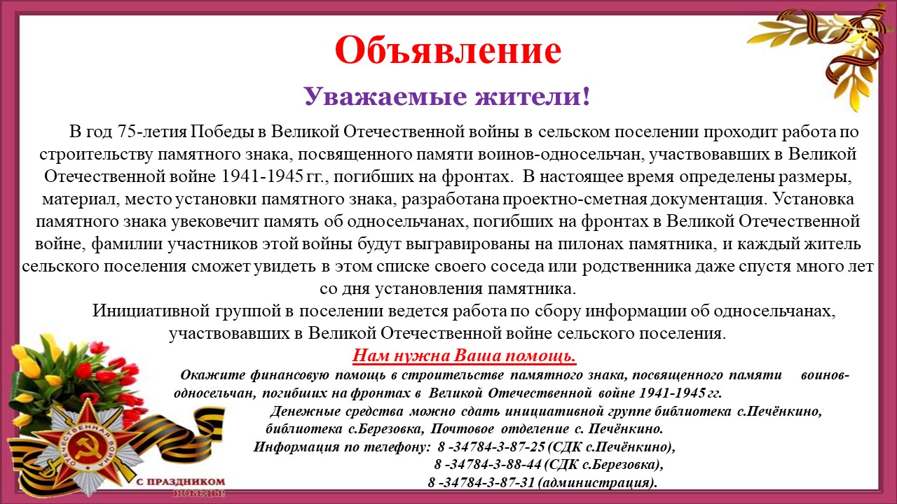 Объявление о строительстве памятного знака, посвященного памяти воинов-односельчан, участвовавших в ВОВ.